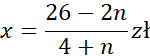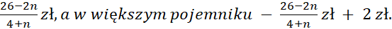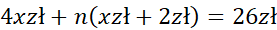 Nie znamy dokładnej ceny produktów, zatem wprowadzamy oznaczenie x, aby móc wykonać dalsze obliczenia. Całkowita cena zakupów składała się z n większych pojemników oraz 4 opakowań mniejszych, więc, mnożąc ich ilość przez cenę pojemnika, otrzymujemy całkowitą cenę zakupów. Dokonując dalszych przekształceń, otrzymujemy poszukiwaną cenę jednego produktu.