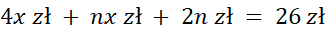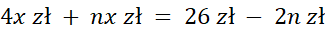 W tym zadaniu musisz obliczyć cenę obu rodzajów jogurtów. Za n mniejszych jogurtów i 4 mniejsze jogurty Marek zapłacił 26 zł. Większy jogurt był droższy o 2 zł.