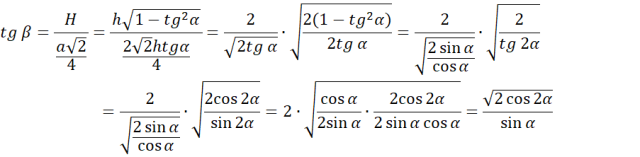 Ze wzoru na tangens w trójkącie będącym połową ściany bocznej wyznacz długość krawędzi podstawy. Następnie skorzystaj z twierdzenia Pitagorasa w trójkącie zawierającym wysokość ostrosłupa, połowę krawędzi podstawy i wysokość ściany bocznej, aby wyznaczyć długość pierwszej z nich. Na koniec oblicz tangens szukanego kąta, uzyskane wyrażenie doprowadź do najprostszej postaci. Skorzystaj ze wzoru na tangens i sinus podwojonego kąta.