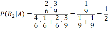 Wyznacz prawdopodobieństwo tego, że kula pochodzi z drugiej urny, jeśli jest to kula czarna i rzucamy raz kostką. Jeżeli wypadnie mniej niż 5 oczek, to losujemy jedną kulę z pierwszej urny, która zwiera 5 kul białych i 1 kulę czarną. W przeciwnym razie losujemy jedną kulę z drugiej urny, która zawiera 6 kul białych i 3 kule czarne.