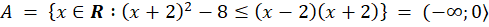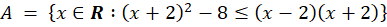 Rozwiąż nierówność w definicji zbioru A. W tym celu wymnóż wszystkie nawiasy, korzystając ze wzorów skróconego mnożenia, a następnie zredukuj wyrazy podobne po obu stronach nierówności. Przeczuć wszystkie wyrażenia z x na jedną stronę, a pozostałe na drugą i wyznacz przedział, do jakiego należy x. Zbiór A jest więc tym przedziałem. Ponieważ