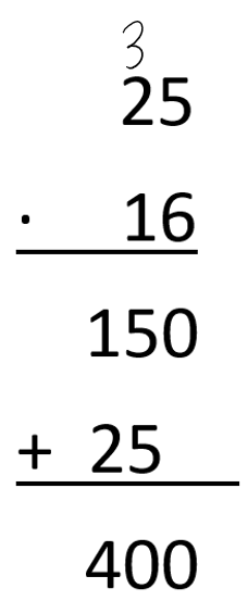 Aby znaleźć iloczyn, pomnóż pisemnie 25 i 16. Wynikiem jest 400. Aby powiększyć ten iloczyn 100 razy, do jego prawej strony dopisz dwa zera.