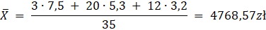 Pewna firma posiada 3 osoby w zarządzie o średnich zarobkach 7,5 tys., 20 osób w dziale marketingu, które zarabiają 5,3 tys. i 12 osób w dziale technicznym o średnich zarobkach równych 3,2 tys. Ile średnio zarabia pracownik tej firmy?