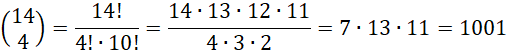 W tej sytuacji liczba jeden jest na pierwszym miejscu 15 cyfrowej liczby oraz wybierasz 4 spośród pozostałych 14 miejsc na „obstawienie” cyfry 1, reszta cyfr wynosi zero: