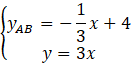 Prosta AC i y=3x przecinają się w punkcie będącym środkiem odcinka AB, nazwij go S. Przyrównaj do siebie wartości y, aby wyliczyć współrzędne punktu przecięcia, będące jednocześnie środkiem odcinka AB.