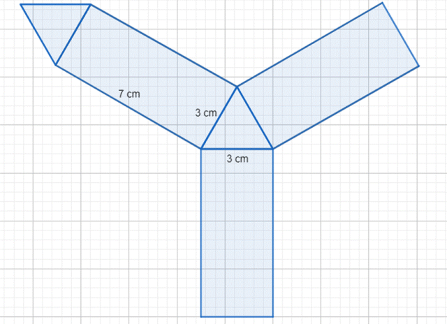 W tym zadaniu musisz narysować w zeszycie siatkę graniastosłupa trójkątnego o krawędzi podstawy równej 3 cm i krawędzi bocznej wynoszącej 7 cm.