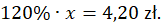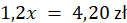 Należy oznaczyć cenę przejazdu przed podwyżką jako x zł. Po podwyżce o 20%, cena wynosiła 4,20 zł. Możesz ułożyć równanie: