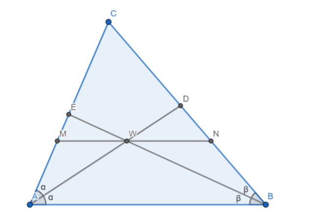 Przez punkt W, w którym przecinają się dwusieczne kątów A i B trójkąta ABC, prowadzona jest równoległa do boku AB. Ta równoległa przecina proste AC i BC odpowiednio w punktach M i N. Wykaż, że długość odcinka MN jest równa sumie długości odcinków AM i BN.