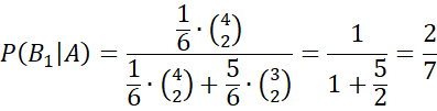 Wyznacz prawdopodobieństwo tego, że pochodzą one z pierwszej urny, jeśli wylosowywano dwie kule czarne i rzucamy raz kostką. Jeżeli wypadnie 6 oczek, to losujemy 2 kule z pierwszej urny, która zawiera 2 kule białe i 4 kule czarne. W przeciwnym razie losujemy 2 kule z drugiej urny, która zawiera 3 kule białe i 3 kule czarne.