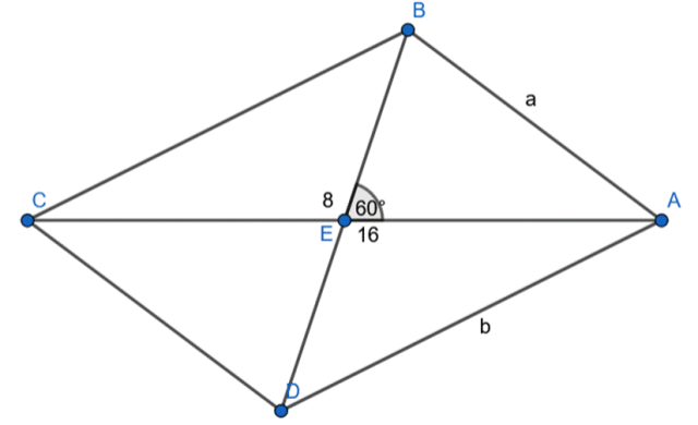 Wyznacz obwód równoległoboku, którego przekątne mają długości 16 i 8, a kąt zawarty między nimi ma miarę .