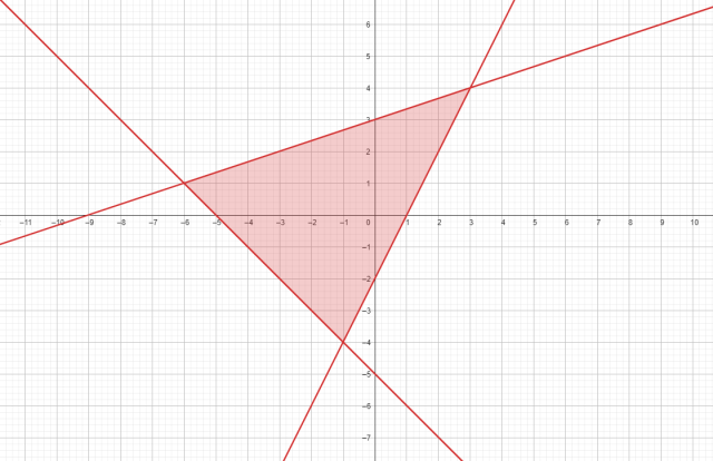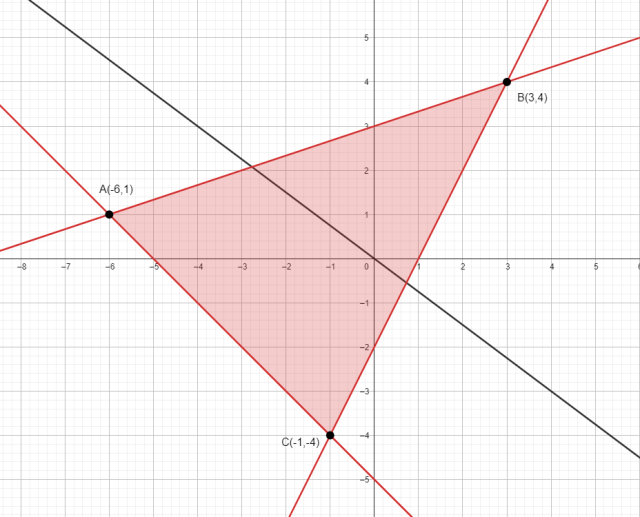 Przekształcamy równanie prostej Naszkicujmy prostą dla w tym samym układzie współrzędnych. Dodatkowo nanosimy współrzędne wierzchołków powstałego trójkąta.