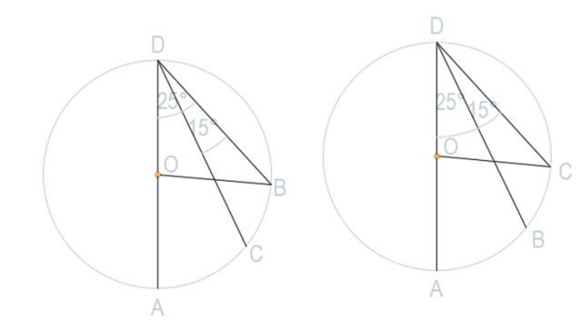 Dany jest okrąg o środku w punkcie O. Wyznaczono na nim punkty A, B, C, D. Odcinek AC jest jego średnicą, |∢ ADB | = 25° oraz |∢ BDC | = 15°. Podaj miarę kąta COD, weź pod uwagę dwie możliwości.