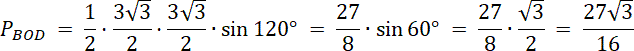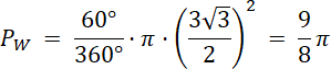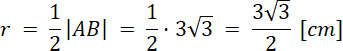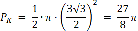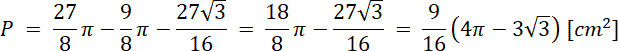 Oblicz pole zamalowanej figury jako różnicę pola półkola i dwóch pól: trójkąta i wycinka koła.