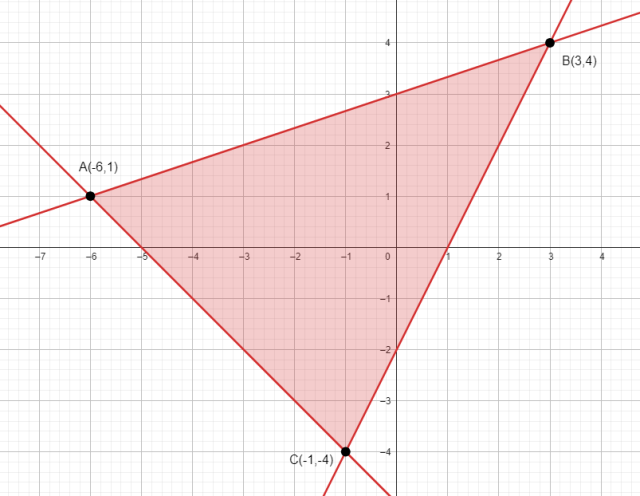 Przekształć nierówności wchodzące w skład układu i wyznacz graficzną reprezentację zbioru A. Wyrażenie 2y-x przyjmuje wartość minimalną w jednym z wierzchołków powstałego obszaru. Wstaw współrzędne wierzchołków powstałego trójkąta i zbadaj, dla którego z nich osiąga ono najmniejszą wartość.