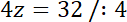 Aby obliczyć z, musisz pozbyć się wyrażeń stojących po jego stronie równania. Podziel obustronnie przez 4, ponieważ dzielenie jest działaniem przeciwnym do mnożenia.