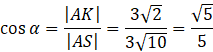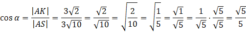 Cosinus kąta α pomiędzy krawędzią boczną, a płaszczyzną podstawy to stosunek długości przeciwprostokątnej AK do przyprostokątnej AS w trójkącie prostokątnym ASK.