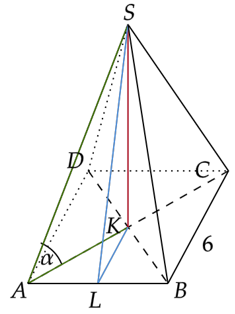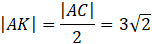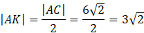 Zauważ, że długość odcinka AK stanowi połowę przekątnej podstawy ostrosłupa.