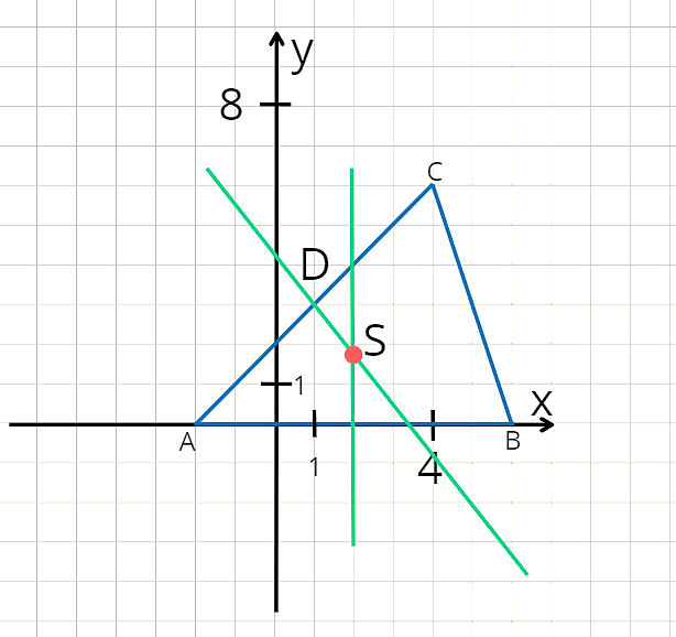 Środek okręgu S znajduje się w punkcie przecięcia symetralnych boków trójkąta. Symetralna boku AB: