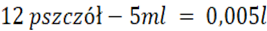 Jako x oznaczamy ilość potrzebnych pszczół do wyprodukowania 1 l miodu. Wiedząc, że 12 pszczół produkuje 5 ml, a to jest