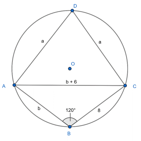 Narysuj rysunek pomocniczy. Oblicz długość odcinka a korzystając z twierdzenia cosinusów. Następnie skorzystaj z własności czworokątów wpisanych w okrąg, aby wyznaczyć miarę kąta ADC – suma miar kątów naprzeciwległych jest równa