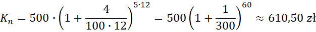 Ustal, do jakiej kwoty wzrośnie kapitał 500 zł złożony w banku na pięć lat, jeżeli roczna stopa procentowa wynosi 4%, a odsetki są kapitalizowane co miesiąc.