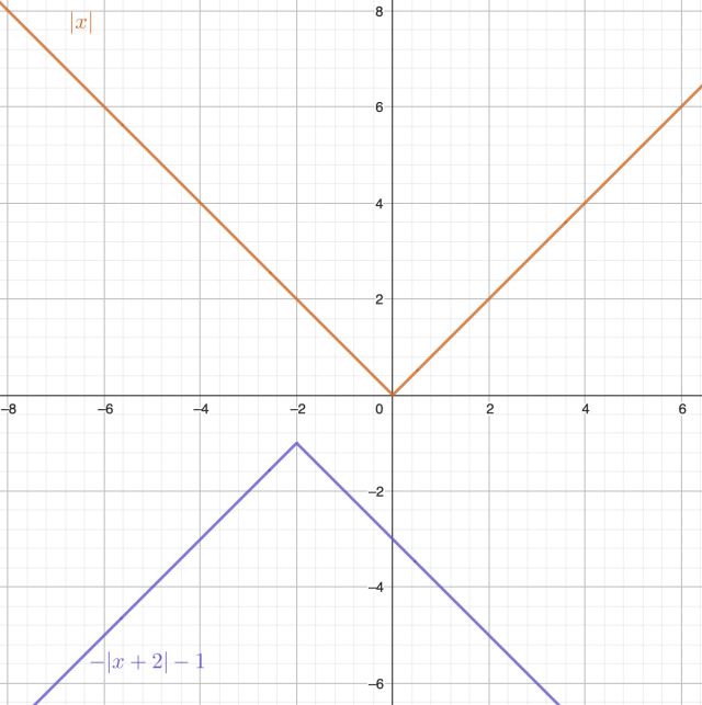 Zauważ, że wykres funkcji g jest przesunięciem wykresu funkcji f o 2 jednostki w lewo, następnie odbiciem symetrycznym powstałego wykresu względem osi OX, a następnie przesunięciem wykresu o jedną jednostkę w dół.