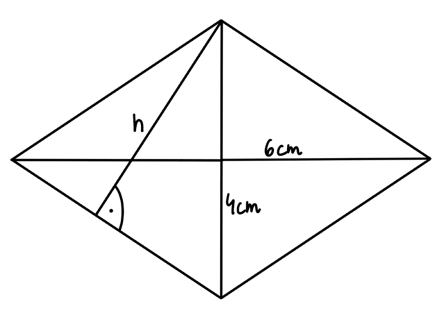 Narysuj przekątne o długości 12 cm i 8 cm przecinające się pod kątem prostym w połowie długości. Połącz ich końce, dorysowując boki rombu. Zaznacz jego wysokość na rysunku, opuszczając ją pod kątem prostym z wierzchołka do podstawy.