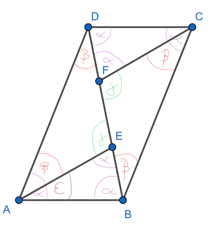 Równoległobok ABCD jest przedstawiony na rysunku 3. Długości odcinków AD, DB i BC są sobie równe, a na przekątnej BD można zlokalizować punkty E i F, gdzie BA = AE = ED = DC = CF = FB. Oblicz miary kątów tego równoległoboku.