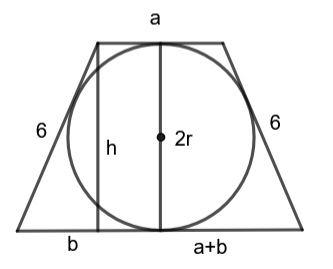 Wyznacz obwód i pole tego trapezu, jeśli wiadomo, że jego ramię ma długość 6 cm, a promień okręgu wpisanego jest równy 2,5 cm.