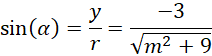Oblicz wartość m, dla której wartość funkcji sinus kąta α, którego ramię końcowe zawiera punkt P(m, -3), wynosi