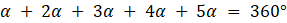 Okrąg został podzielony punktami A, B, C, D i E na łuki o stosunku długości 1:2:3:4:5. Podaj miary kątów pięciokąta ABCDE.