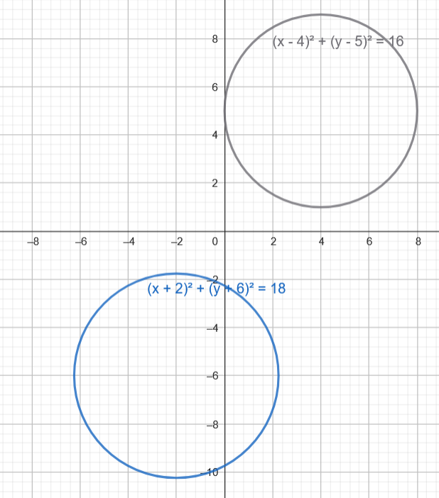 Skorzystaj z tego, że równanie okręgu można opisać za pomocą wzoru: , gdzie to środek okręgu, a to jego promień i na tej podstawie narysuj je w jednym układzie współrzędnych i ustal, ile punktów wspólnych mają one ze sobą.
