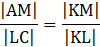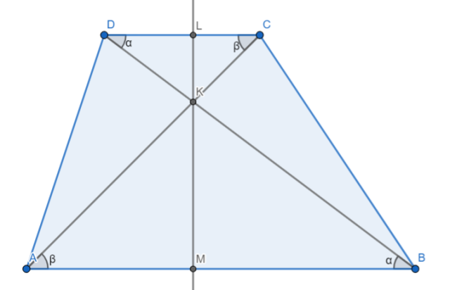 Przez punkt K przecięcia się przekątnych AC i BD trapezu poprowadzono prostą m, która jest prostopadła do obu podstaw trapezu. Prosta m przecina krótszą podstawę DC trapezu w punkcie L, a dłuższą podstawę AB w punkcie M. Wiadomo, że długość odcinka LM wynosi 12 cm, długość odcinka KL wynosi 2 cm, a długość odcinka LC wynosi 3 cm. Oblicz długość przekątnej AC trapezu.