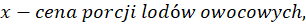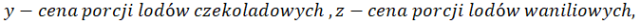 W tym zadaniu musisz określić, które lody były najdroższe, jeżeli dwie porcje lodów owocowych kosztuje tyle samo co porcja lodów czekoladowych i porcja lodów waniliowych. Ponadto za dwie porcje lodów czekoladowych trzeba zapłacić tyle, ile za jedną porcję lodów owocowych i dwie porcje lodów waniliowych.