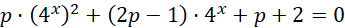 Zauważ, że równanie przedstawione w treści zadania to równanie kwadratowe z parametrem. Zastąp funkcję wykładniczą zmienną pomocniczą, a następnie wyznacz wartości 𝑝, dla których wyróżnik wielomianu jest równy zeru oraz miejsce zerowe wielomianu jest dodatnie, lub dla których wyróżnik jest większy bądź równy zeru i dokładnie jedno z rozwiązań jest dodatnie. Skorzystaj w tym celu ze wzoru Viete’a: