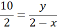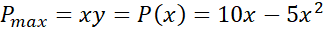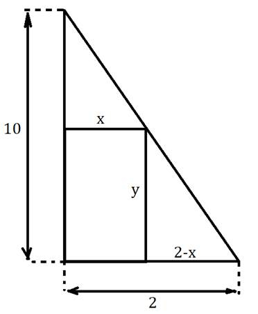 Korzystając z rysunku, tworzymy proporcję, która z kolei wynika bezpośrednio z twierdzenia Talesa. Z proporcji tej wyznaczamy bok y zależny od boku x i wstawiamy do funkcji pola jako iloczyn boków. Dziedzinę określamy żądaniem, aby każdy bok był dodatni. Funkcja pola jest kwadratowa z ujemnym współczynnikiem kierunkowym, zatem jej maksimum znajduje się w wierzchołku paraboli.