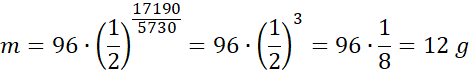 Ustal, jaką masę będzie miała próbka izotopu o masie początkowej około 96 gramów po upływie 17 190 lat, jeśli okres połowicznego rozpadu izotopu węgla