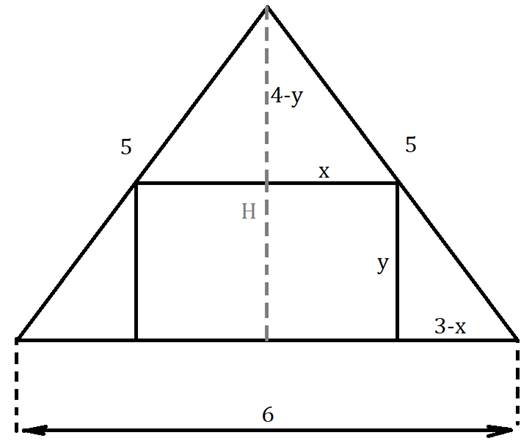 Z twierdzenia Pitagorasa wynika wartość wysokości dużego trójkąta. Znając tę wartość, możemy skorzystać z proporcji wynikającej z twierdzenia Talesa i wyznaczamy z niej bok y zależny od x. Dziedzinę tworzymy, żądając, aby każdy z boków był dodatni. Funkcja pola to iloczyn boków x i y.