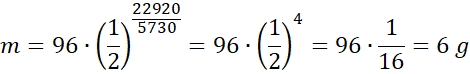Ustal, jaką masę będzie miała próbka izotopu o masie początkowej około 96 gramów po upływie 22 920lat, jeśli okres połowicznego rozpadu izotopu węgla