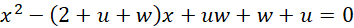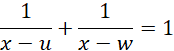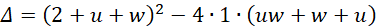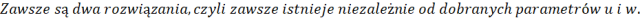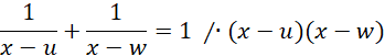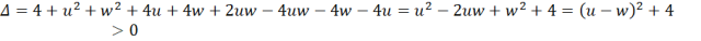 Najpierw zapisujemy założenia, aby później móc przemnożyć równanie obustronnie przez mianowniki ułamków, następnie sprowadzamy wyjściowe równanie do równania kwadratowego zmiennej x i parametrach u i w. Rozpisujemy deltę i przekształcamy, gdzie w końcowej równości korzystamy ze wzoru skróconego mnożenia na kwadrat różnicy. Otrzymujemy kwadrat liczby dodać 4, co jest zawsze większe od 0, gdyż kwadrat dowolnej liczby rzeczywistej jest nieujemny. Zatem delta jest zawsze dodatnia, a to daje nam oczekiwany rezultat.