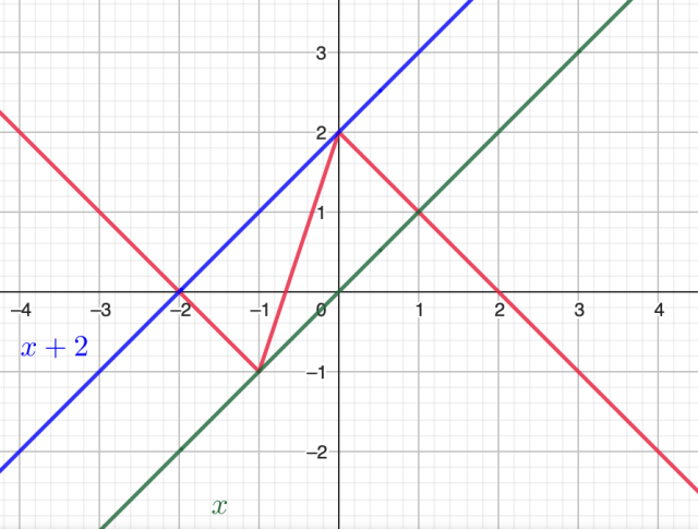 Najpierw zdefiniuj nową funkcję: Zauważ, że równanie to ma dwa lub trzy rozwiązania, wtedy, kiedy wykresy funkcji i przetną się dwa lub trzy razy. Wykres funkcji g jest prostą pod kątem 45 do osi OX przesuniętą o pewną ilość jednostek w górę lub w dół. Zatem te wykresy przecinają się tylko dwa razy dla lub .