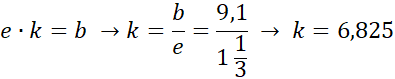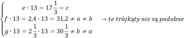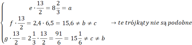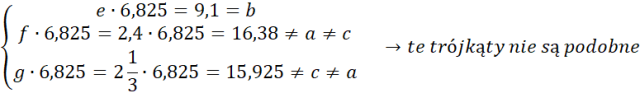 Jeżeli te trójkąty są do siebie podobne, to każdy z boków e, f, g powinien być podobny do boków a, b, c w tej samej skali podobieństwa k.