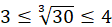 Pierwiastek trzeciego stopnia z 30 jest większy od pierwiastka trzeciego stopnia z 27, czyli liczby 3 i mniejszy od pierwiastka trzeciego stopnia z 64, czyli liczby 4.