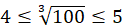 Pierwiastek trzeciego stopnia z 100 jest większy od pierwiastka trzeciego stopnia z 64, czyli liczby 4 i mniejszy od pierwiastka trzeciego stopnia z 125, czyli liczby 5.