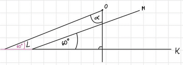 W pierwszym kroku wykonaj rysunek. Następnie Narysuj kąt KLM oraz prosta prostopadła do odcinka KL i równoległą do LM. Zauważ, że gdy przedłużysz odcinek KL, otrzymasz trójkąt prostokątny. Z faktu, że prosta KL przecina dwie proste równoległe, otrzymujesz kąt 60º w nowo powstałym trójkącie. A z tego, że suma miar kątów w trójkącie wynosi 180º, otrzymujesz ostatecznie, że szukany kąt α = 180º – 90º – 60º = 30º.