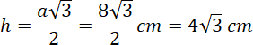 Długość krótszej przekątnej jest taka sama jak długość boku rombu, więc przekątna utworzyła trójkąt równoramienny. Oblicz wysokość trójkąta, która jest również wysokością rombu: