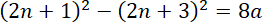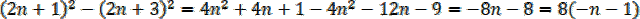 Dwie kolejne liczby całkowite nieparzyste to 2n + 1 i 2n + 3, gdzie n to liczba naturalna. Różnica ich kwadratów wynosi