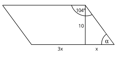 Dany równoległobok o jednym z kątów miary 104° i wysokości 10 cm. Znajdź pole tego równoległoboku, jeśli wysokość dzieli podstawę w stosunku 1:3.