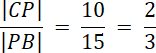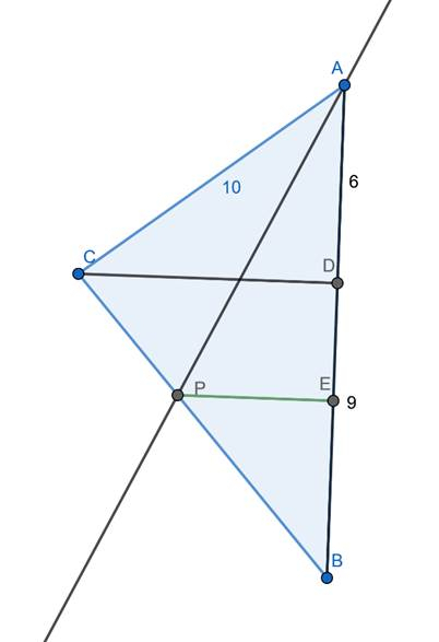 W trójkącie ABC bok AC ma długość 10 cm. Wysokość CD dzieli bok AB na odcinki AD i DB. Dwusieczna kąta BAC przecina bok BC w punkcie P. Wiedząc, że |AD| = 6 cm, |DB| = 9 cm, musisz obliczyć odległość punktu P od podstawy AB.