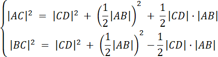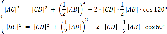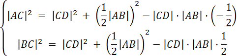 Rozwiąż układ równań z dwoma równaniami, które ułożysz korzystając z twierdzenia cosinusów. Wykaż, że prawdziwa jest równość